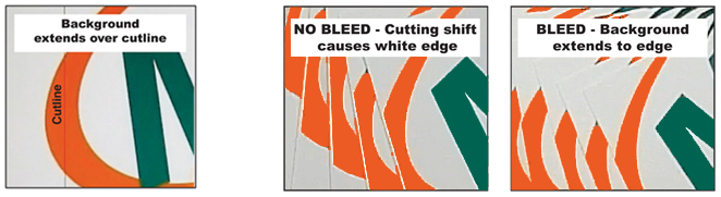 It is very difficult to print exactly to the edge of a sheet of paper/card, to achieve this it is necessary to print a slightly larger area than is needed and then trim the paper/card down to the required finished size. Images, background images and fills which are intended to extend to the edge of the page must be extended beyond the trim line to give a bleed.