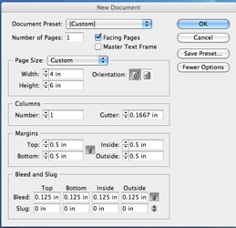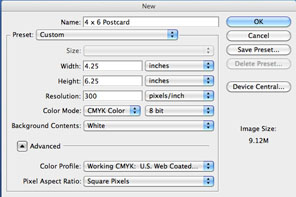 When creating your document, simply make the calculations to the artwork size as shown in example for 4 x 6 postcard. Add bleed to your document size and enter them into the Width and Height boxes.