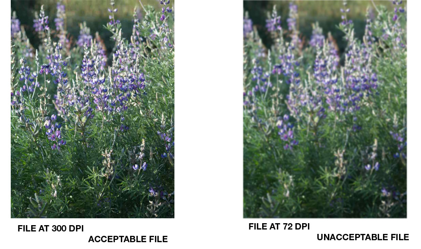 Resolution refers to the number of dots per square inch or DPI. For quality printing, 300 dpi is required. The more dots, the more detail, but creating a file more that 300 DPI will not improve quality and it will only make files size too large. Creating files at higher than 300 DPI adds unnecessary information and waste time processing. Less dots, less sharpness and detail. Never send a file from something you have taken off the internet. If the original file size was online, it is 72 dpi and you cannot add more information to expanded it to 300.